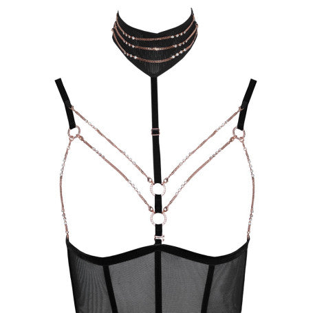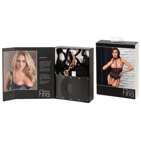 Elegante e invitantemente rivelatore! Body senza seno di Abierta Fina con cavallo completamente aperto in powernet con strisce di velluto elastico ed elementi di gioielleria color oro rosa. Cinghie e bretelle regolabili, bretelle anche rimovibili. Cinghia regolabile del décolleté con collana ornata di catene (con chiusura a bottone) anch'essa rimovibile, così come le catene del seno con piccoli moschettoni e la catena inguinale con anello decorativo. Tutte le catene sono inoltre decorate con piccoli strass. Vista posteriore in look a due pezzi con due chiusure a clip su reggiseno e mutandine/cintura in vita. 90% poliammide, 10% spandex. Senza calze.