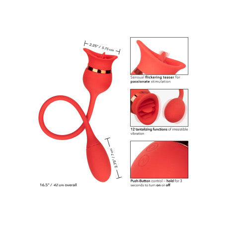 Oh Casanova! Il sensuale French Kiss Casanova è un irresistibile stuzzicatore tremolante con un potente bullet vibrante per un gioco davvero appassionato. Questo potente vibratore vi mostrerà la vera estasi ad ogni sfarfallio del teaser a lingua, con doppio motore vibrante e 12 funzioni di vibrazione. Mentre il teaser tremolante fa la sua magia, il potente bullet si flette e si muove con il vostro corpo per offrire vibrazioni da far tremare le ginocchia. Il teaser e il bullet possono essere usati indipendentemente o contemporaneamente per una stimolazione mozzafiato. Il teaser a contatto pieno e la lingua svolazzante sono stati realizzati per adattarsi perfettamente ai vostri punti di piacere più intimi. Il silicone morbido ed elastico e il corpo sensualmente sagomato consentono di offrire un piacere puro e mirato da qualsiasi angolazione. Usate il pulsante easy-touch per controllare fino a 70 minuti di piacere vibrante a bassa velocità e 50 minuti ad alta velocità. Ricaricate il vostro piacere in soli 100 minuti con il cavo USB in dotazione nella porta di ricarica auto-riparante del massaggiatore. Le dimensioni discrete del mini massaggiatore e il pulsante di blocco da viaggio lo rendono il compagno di viaggio perfetto, che vi permetterà di abbracciare il piacere irradiato ovunque vi portino le vostre fantasie.